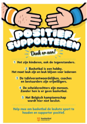 Respect voor Supporters: Het begroeten en bedanken van supporters is een belangrijk onderdeel van de sportcultuur. Na elke wedstrijd is het gebruikelijk om supporters te bedanken voor hun steun. Dit kan door middel van een kort gebaar, zoals een handzwaai of door even naar hen toe te lopen. Na het douchen bij thuismatchen, begroeten de spelers/speelsters altijd de supporters in de basketbar.